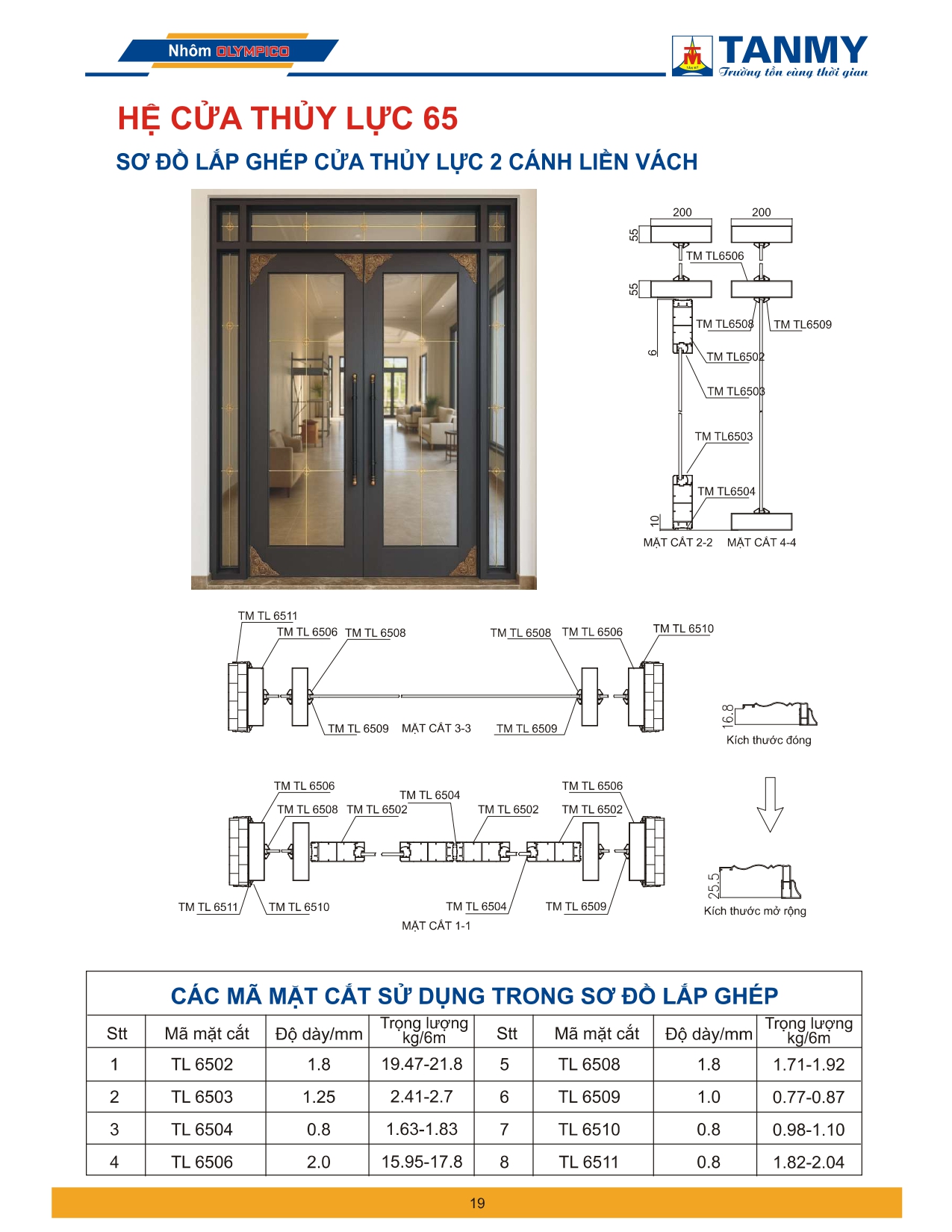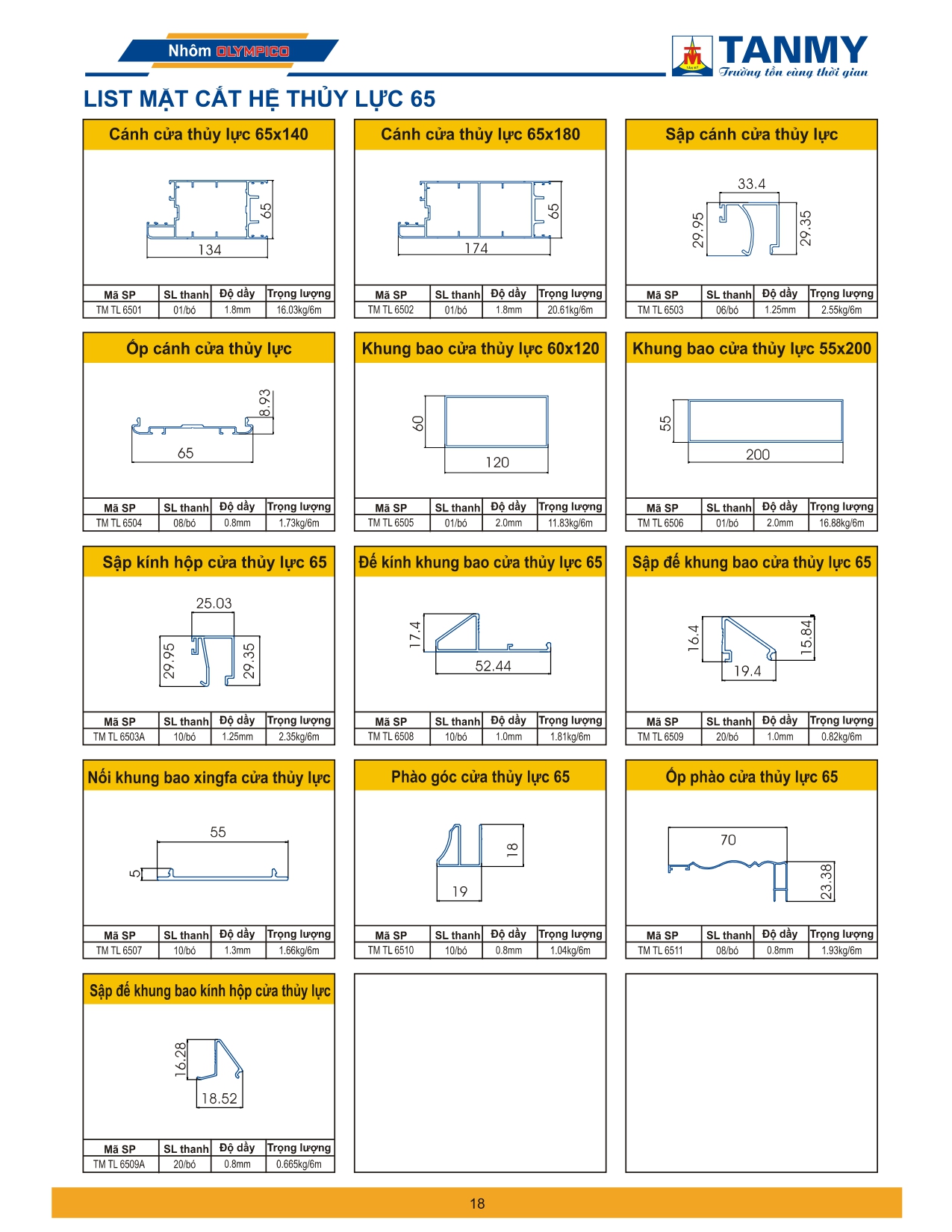 THÔNG SỐ KỸ THUẬT NHÔM HỆ CỬA THỦY LỰC OLYMPICO - TL65